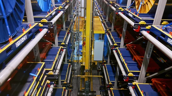 As the available storage area of 800 m² is not extendable, a multi-storey solution was required to meet the growing demand. At the same time, the cable drums, weighing in at 5.3 tons each are susceptible to damage if stored incorrectly. Retrieval and stock tracking posed an additional challenge. The new fully automated 4-level system serviced by an ETV enables the customer to store significantly more stock on the same footprint in a safe and damage-free manner. Up to 293 storage positions can now be managed in the warehouse.