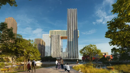 Designed by MVRDV Architects, in collaboration with BPD Bouwfonds Gebiedsontwikkeling and Synchroon Developers, De Sax will become an architectural symbol of Rotterdam’s creativity and modern spirit. Inspired by the elegant curves of a saxophone, the silver-toned twin towers are connected by a gold-coloured beam, reflecting light as if in motion. The building seems to move to its own rhythm – a masterpiece of design and engineering that perfectly captures the city’s dynamic energy. When complete, this award-winning development will offer 916 waterfront apartments, transforming the skyline of Rotterdam and setting new standards in contemporary urban living.