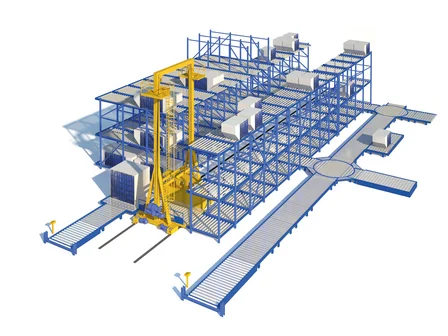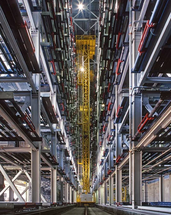 Air cargo terminals handling large volumes need space-efficient and reliable ULD storage solutions. ETV (Elevating Transfer Vehicle) high-bay systems provide fully automated multi-level storage with vertical and horizontal transfer combined in one vehicle. This ensures maximum use of vertical and horizontal space, transparent inventory management and secure, IATA-compliant handling.
