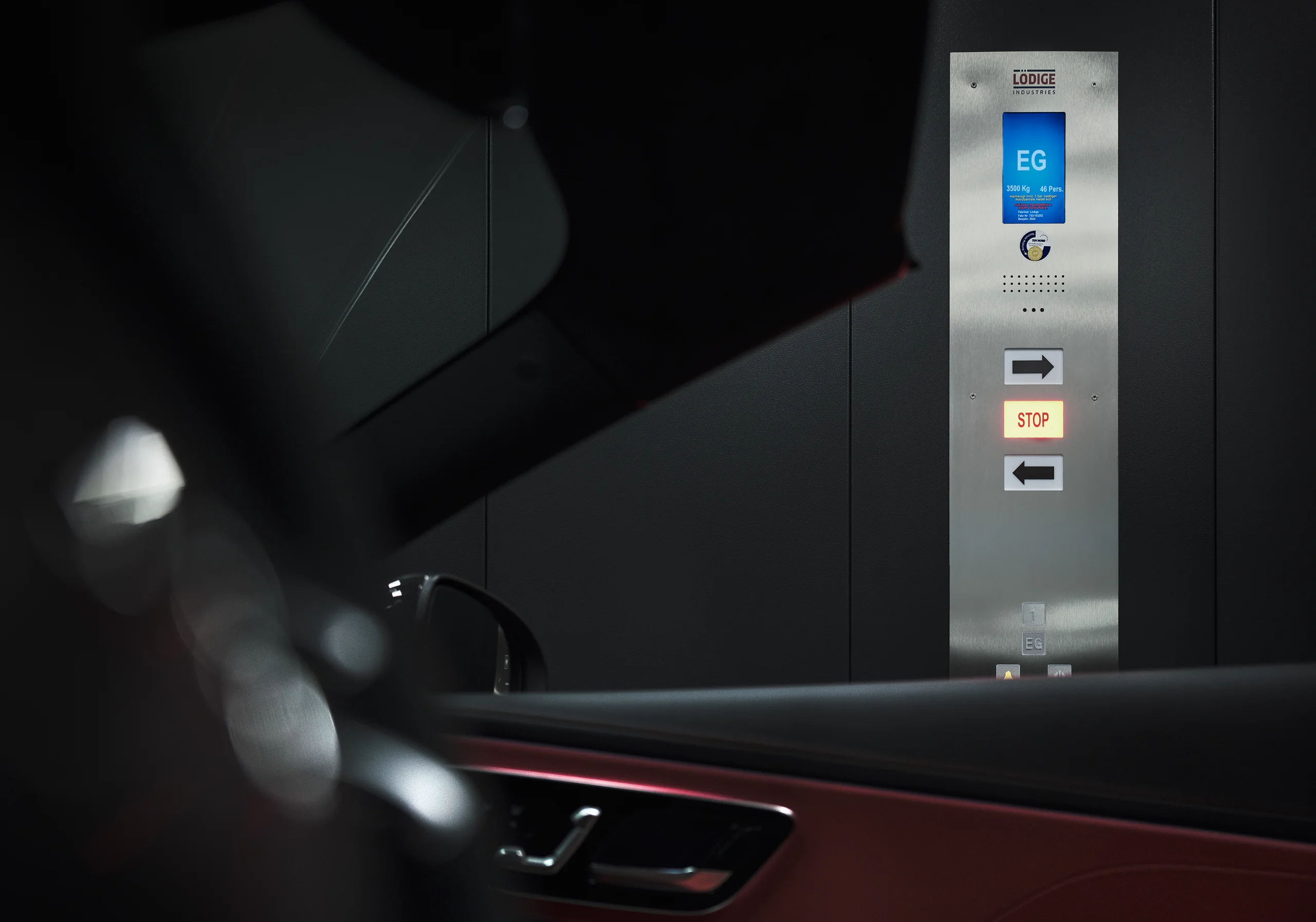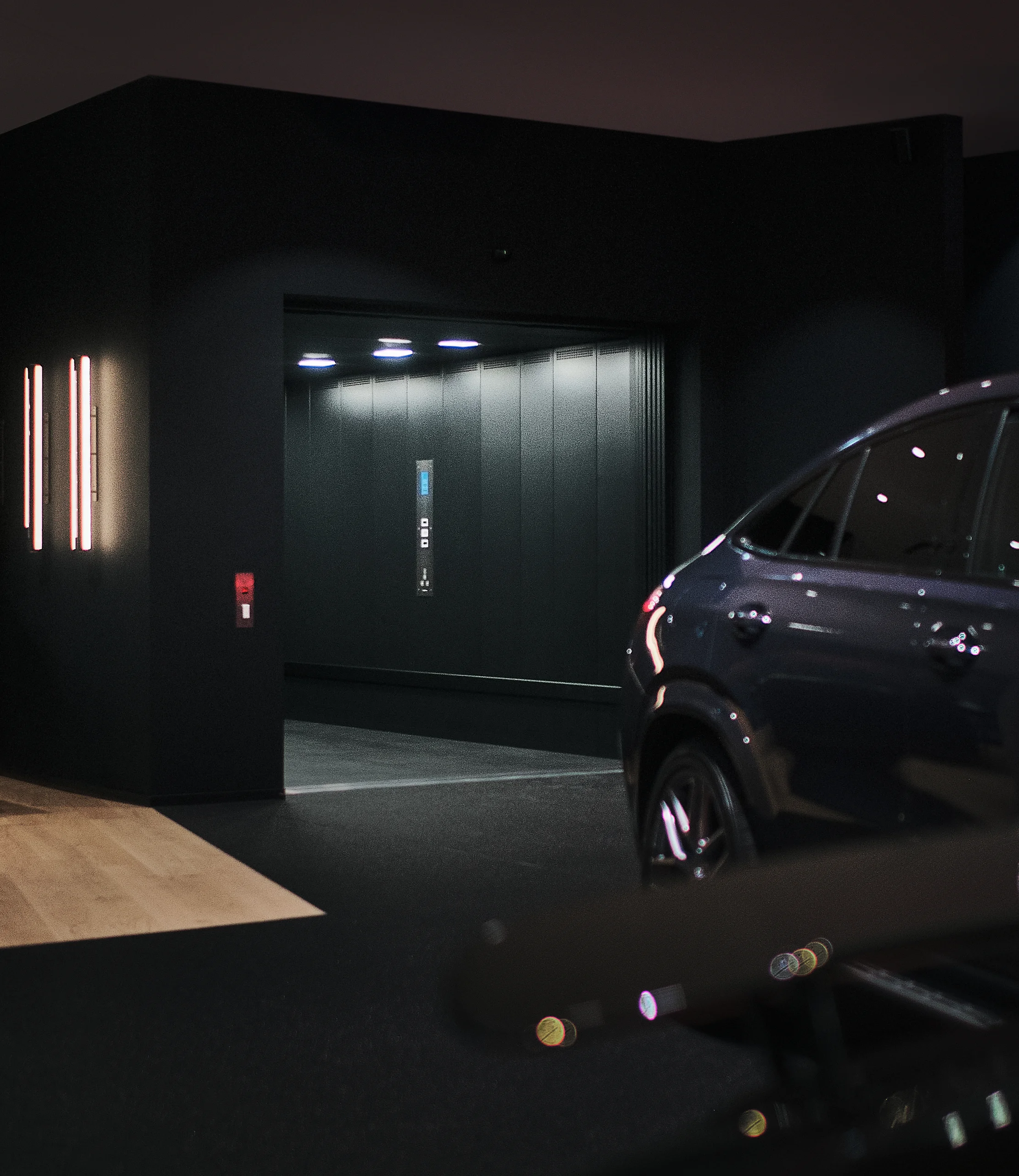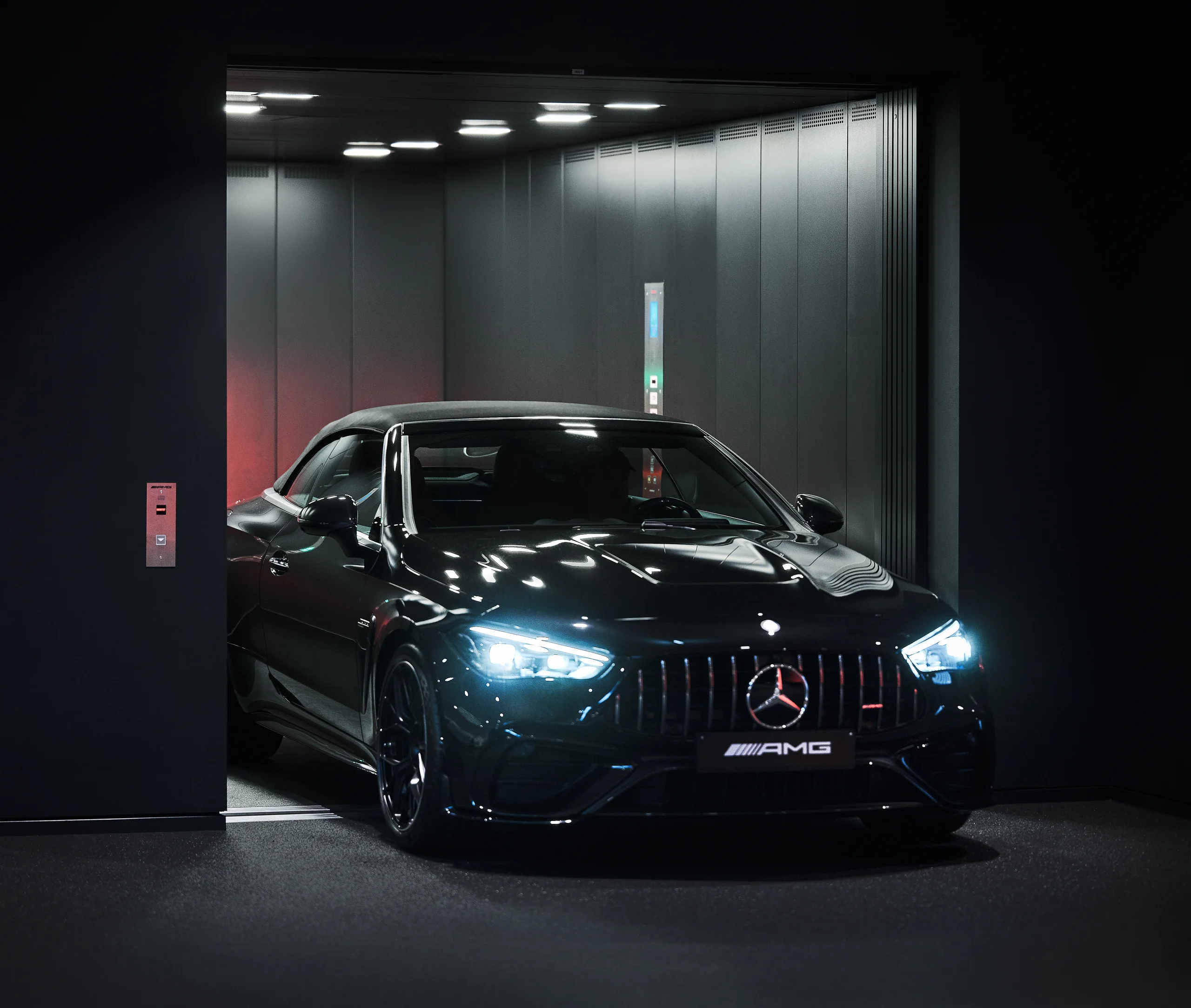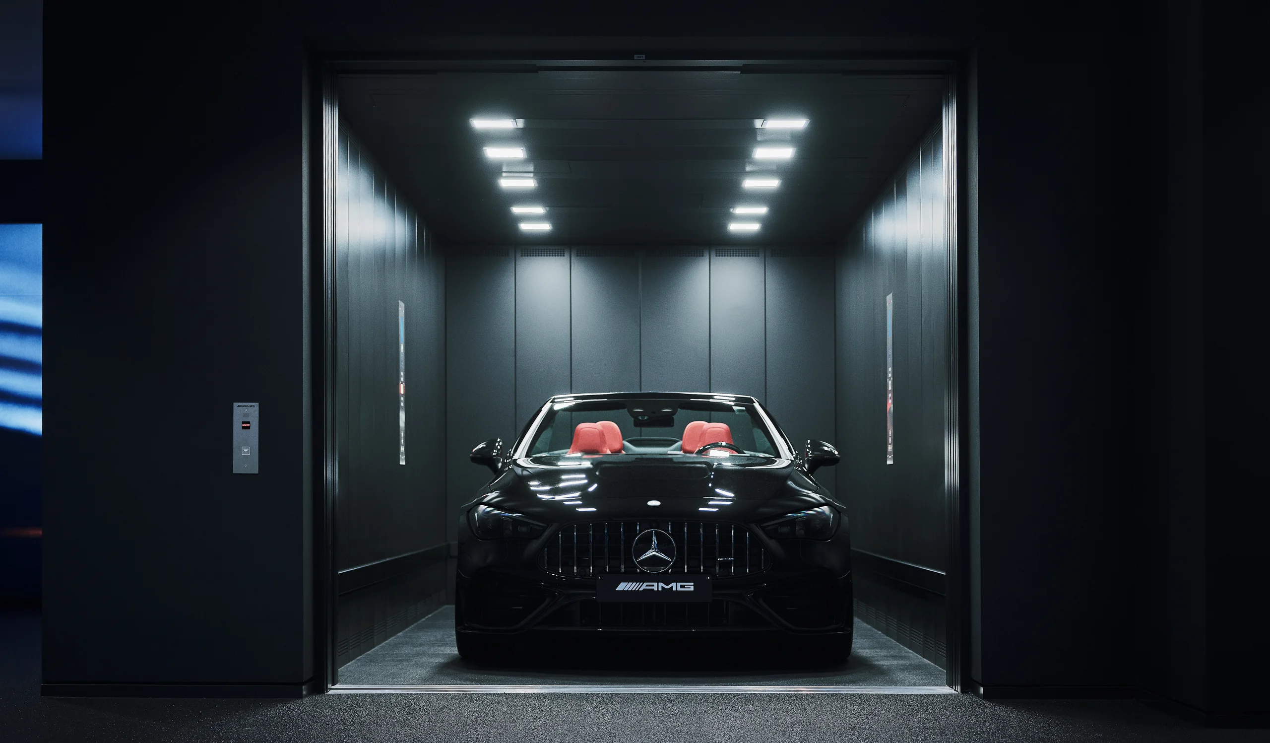 The CARRICO car lift ensures efficient, safe, and elegant vehicle movement between the different levels of the AMG Brand Center. Its generous cabin dimensions are optimized for sports cars and high-performance vehicles. At the same time, its robust construction meets the specific requirements of a brand and service environment where vehicles are not only showcased but also moved, stored, and maintained.