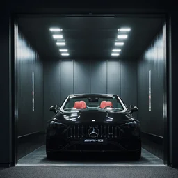 This car lift is a key component of the internal logistics, combining cutting-edge technology with the powerful visual identity of the AMG brand. The dark, fully powder-coated finish in RAL 7021 emphasizes the premium character of the facility and blends seamlessly into the overall architectural concept.